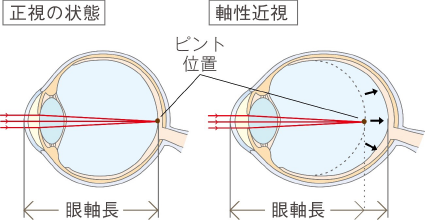 近視とは目の中に入った光のピントが、網膜というカメラのフィルムにあたる組織よりも前の位置で合っている状態のことをいいます。近視は眼球が前後に楕円形状に伸びてしまい(眼軸が伸びる)ことで生じることがあり、一度眼軸が伸びてしまうとそれが戻ることは基本的にはありません。